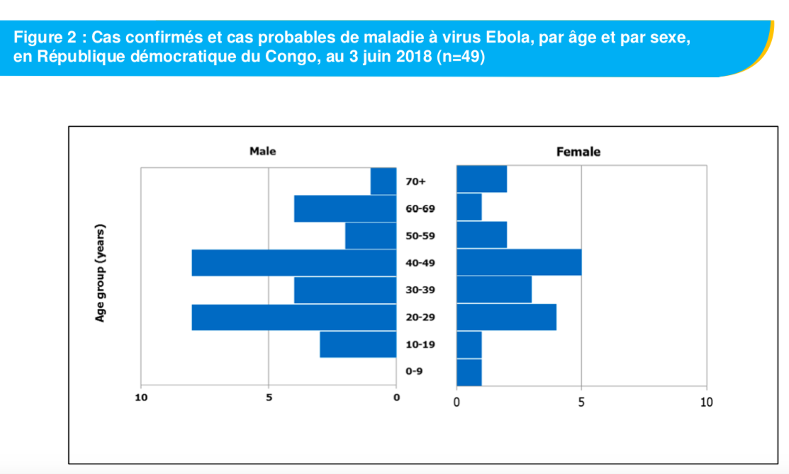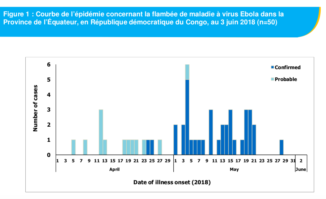 Le bilan du 3 juin de l'Organisation mondiale de la Santé (OMS) fait état de 56 cas, dont 25 décès à Bikoro, Iboko et Wangata. "Parmi ces 56 cas, 37 ont été confirmés en laboratoire, 13 sont des cas probables (décès pour lesquels il n’a pas été possible de collecter des échantillons de laboratoire ou de faire des tests) et six sont des cas suspects", indique l'OMS qui détaille le nombre de cas par localité : "Iboko (23 cas confirmés, 2 cas probables et 5 décès), Bikoro (10 cas confirmés, 11 cas probables, 5 cas suspects et 17 décès) et Wangata (4 cas confirmés, 1 cas suspect et 3 décès). Au 31 mai 2018, 880 contacts (des personnes contaminées, Ndlr) restent suivis activement".
